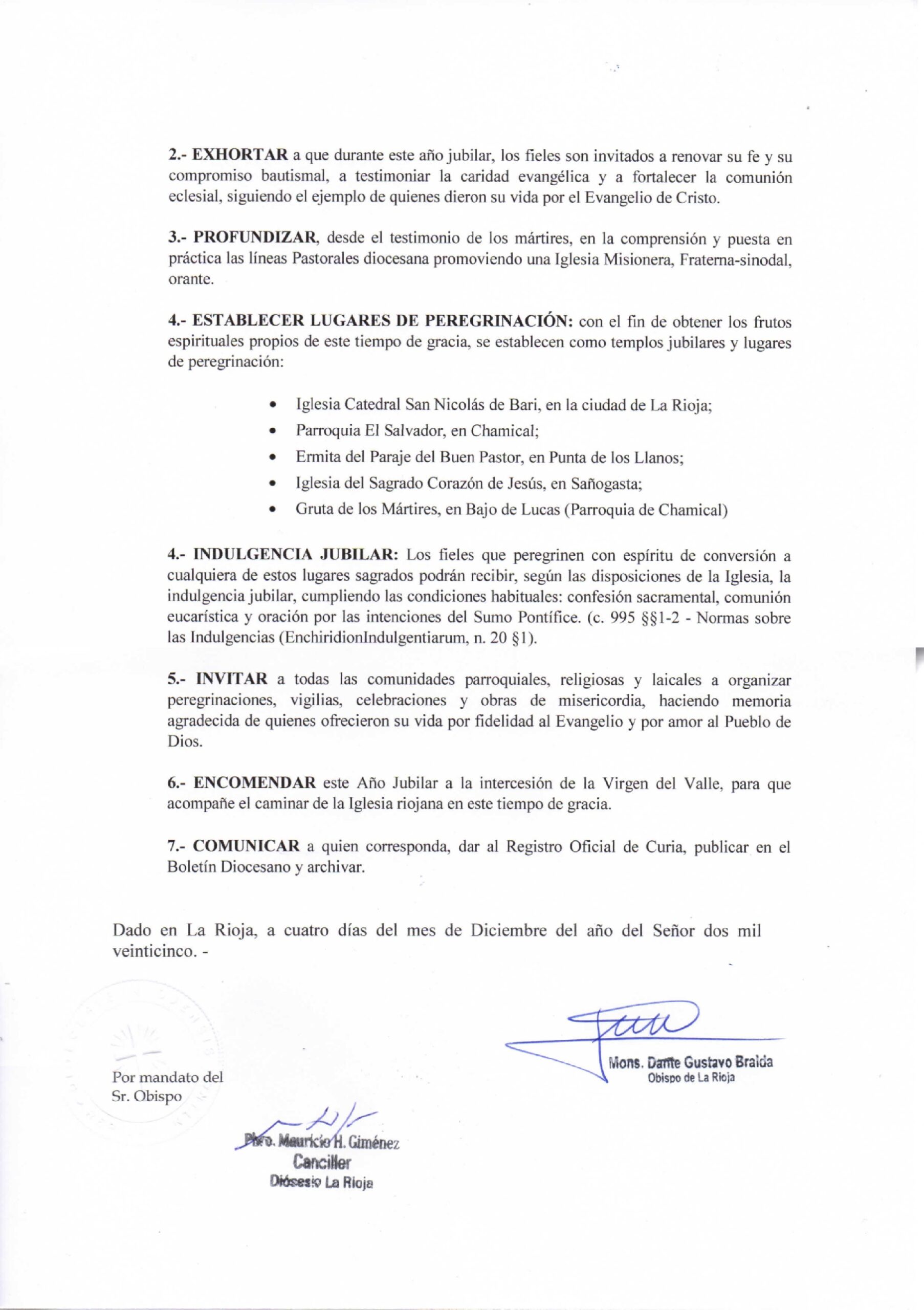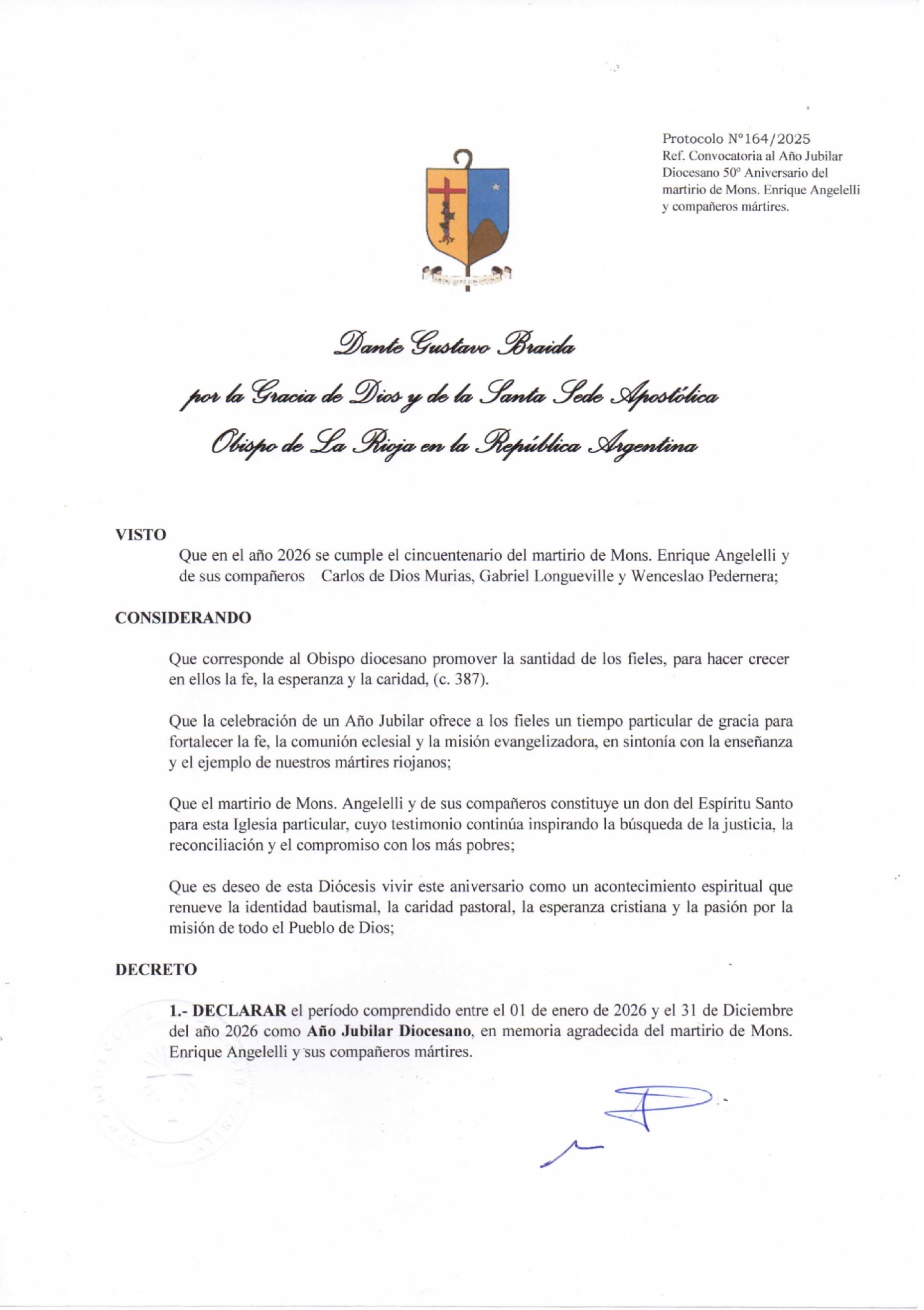 Compartimos el decereto por el cual el Obispo, Monseñor Braida, declara el año 2026 como Jubilar y las acciones con que la Diócesis celebrará a sus Beatos.