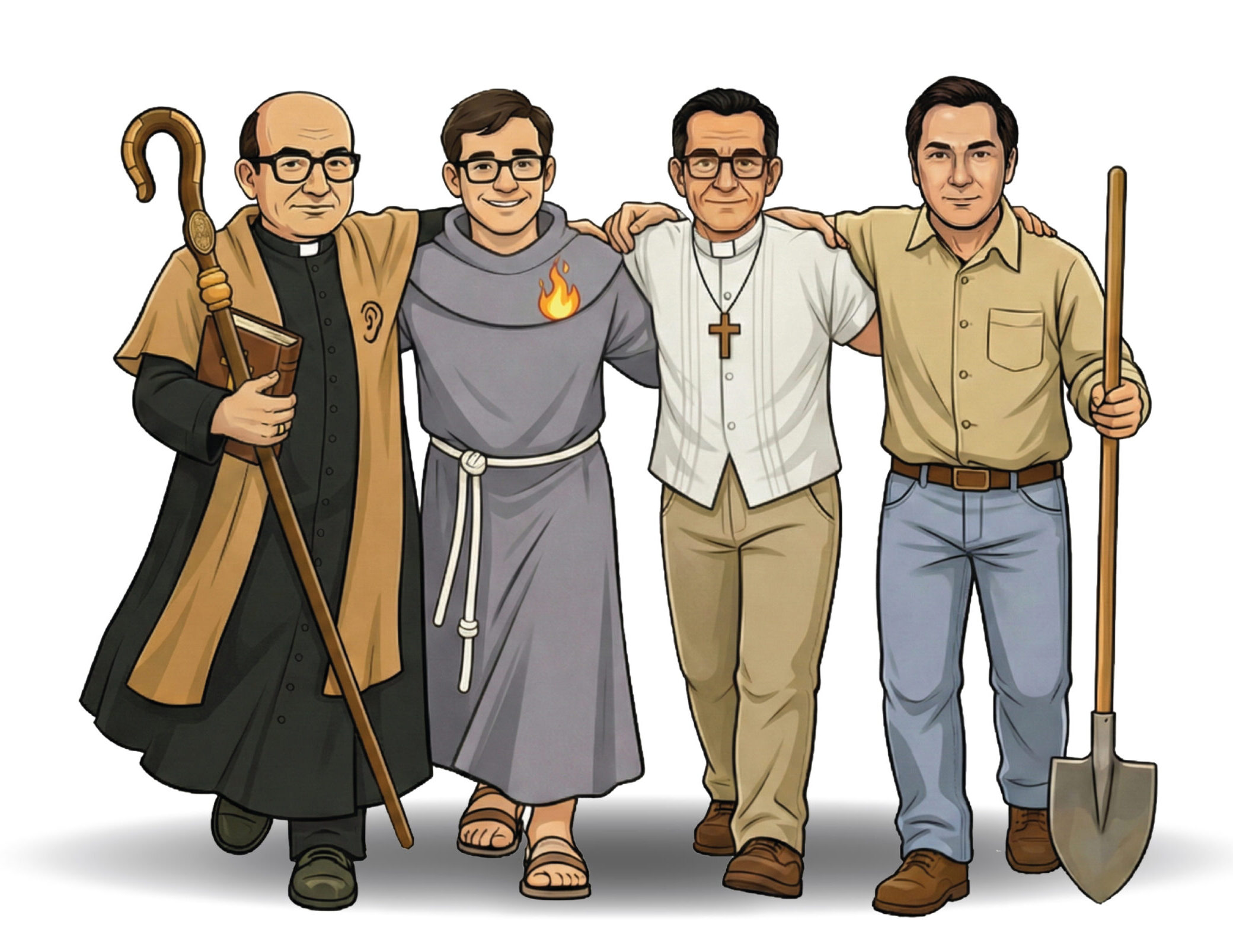 La imagen de los cuatro beatos caminando juntos, abrazados y sin distancias, expresa la comunión profunda que los unió en la vida, en la misión y en el martirio. Representan, a su vez, las diversas vocaciones dentro de la Iglesia: el obispo, los sacerdotes, los religiosos y los laicos.