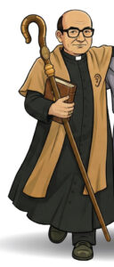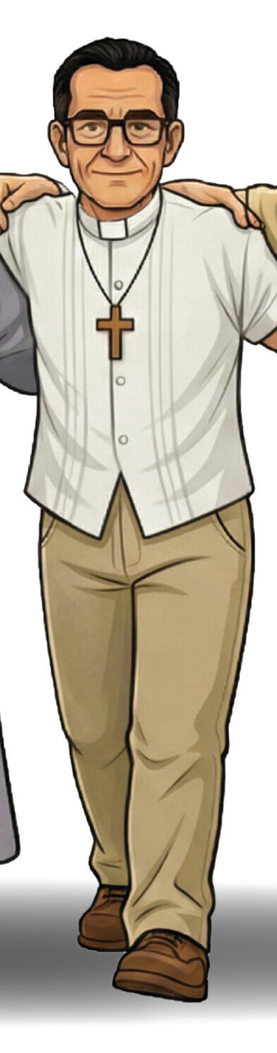 El beato Gabriel Longueville es presentado con su camisa clerical, expresión de su vocación sacerdotal vivida con sencillez y cercanía. La cruz que porta remite a su entrega silenciosa y fiel, marcada por el servicio y el amor profundo a esta tierra riojana que hizo suya, testimoniando una fe misionera que se entrega hasta el final.