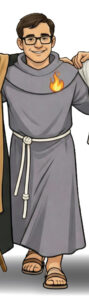 pobreza, sencillez y cercanía a los más humildes. Su sonrisa serena refleja la alegría de vivir el Evangelio, mientras la llama en el corazón simboliza su palabra ardiente y su predicación profética, comprometida con la justicia y la fe vivida hasta el final.
