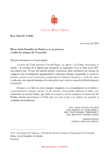 La misiva fue dirigida al arzobispo de Valencia y presidente de la Conferencia Episcopal de Venezuela, monseñor Jesús González de Zárate, y extendida en su persona, a todo el episcopado venezolano, a la Iglesia local y a la sociedad. En la carta, los obispos argentinos hacen llegar el saludo de la Iglesia que peregrina en Argentina y su comunión ante los desafíos actuales.