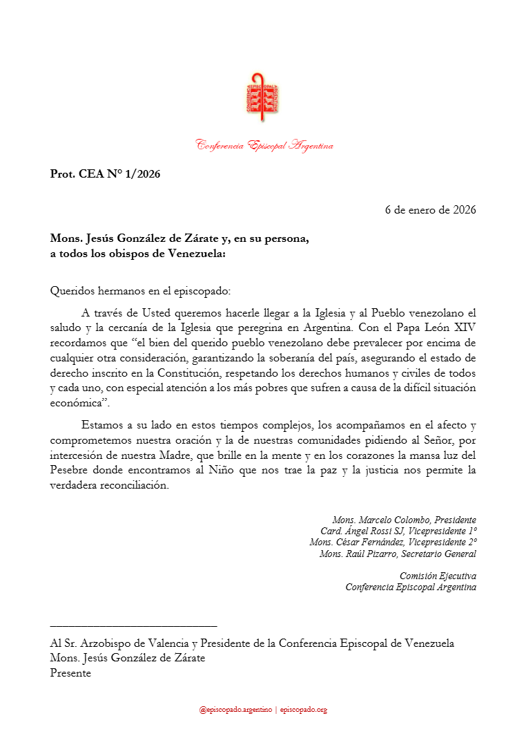 Este 6 de enero, la Comisión Ejecutiva de la Conferencia Episcopal Argentina dirigió una carta a los obispos de Venezuela, expresando su cercanía, acompañamiento pastoral y compromiso de oración ante el delicado momento que atraviesa el hermano pueblo venezolano.